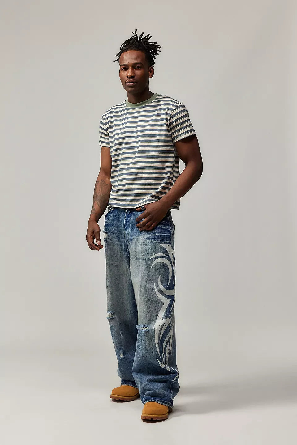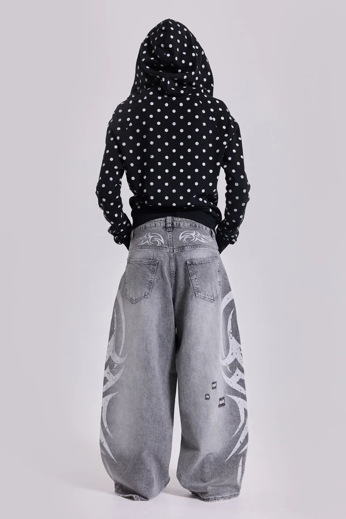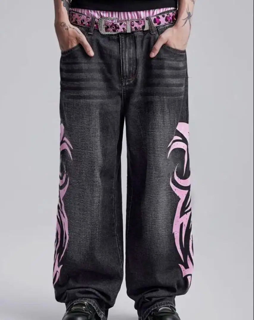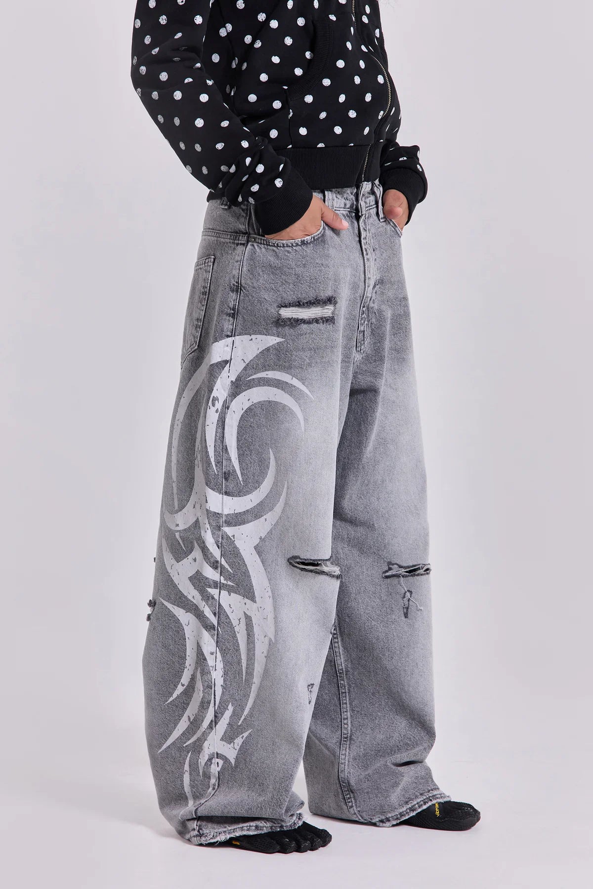 These wide-leg jeans dish out unapologetic Y2K attitude while keeping you ridiculously comfortable: the extra-roomy cut lets your style breathe, the heavyweight denim stands up to curb grinds, and that oversized tribal graphic? Insta-heat that turns sidewalks into runways.