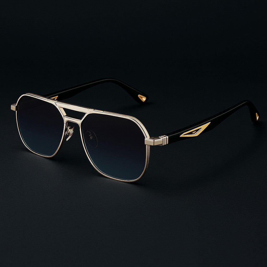 Command attention without saying a word. These sculptural gold-trimmed aviators elevate the everyday with precision lines, luxe materials, and unmistakable presence. Inspired by vintage silhouettes but crafted for modern icons, they fuse sharp geometry with indulgent comfort—designed to turn sunlight into your spotlight.